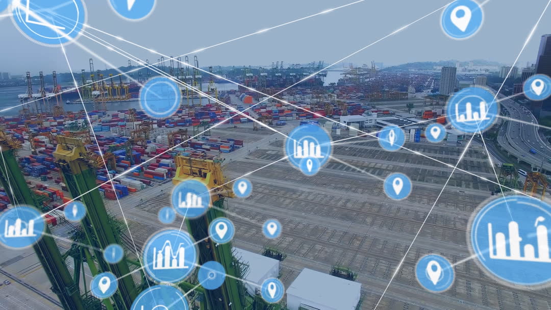 Depicts modern container yard linked by various digital icons, illustrating the integration of technology in the global shipping industry. This can be used to represent innovative logistics solutions, digital transformation in transport, or marketing related to freight and trade businesses.