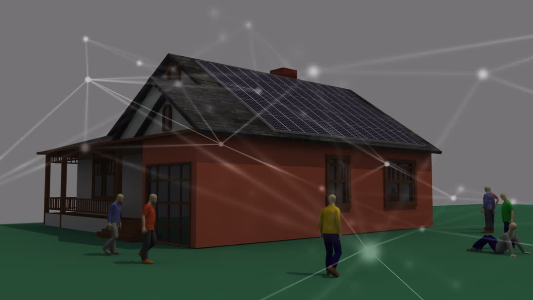 Animation shows network of connections over house with solar panels, representing the integration of digital communication in modern constructions. Illustration ideal for projects involving sustainability, energy efficiency, and smart home solutions. Suitable for technological and environmental presentations, or future-forward business solutions emphasizing innovation and global connectivity.