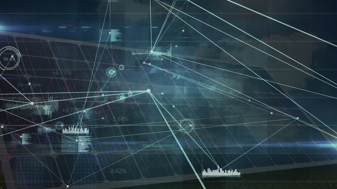 Visual combines solar panels with network graphics, emphasizing renewable energy's technological advancement. Ideal for illustrating advancements in green technology or sustainability. Can be used in articles, presentations, or blogs about environmental innovation.