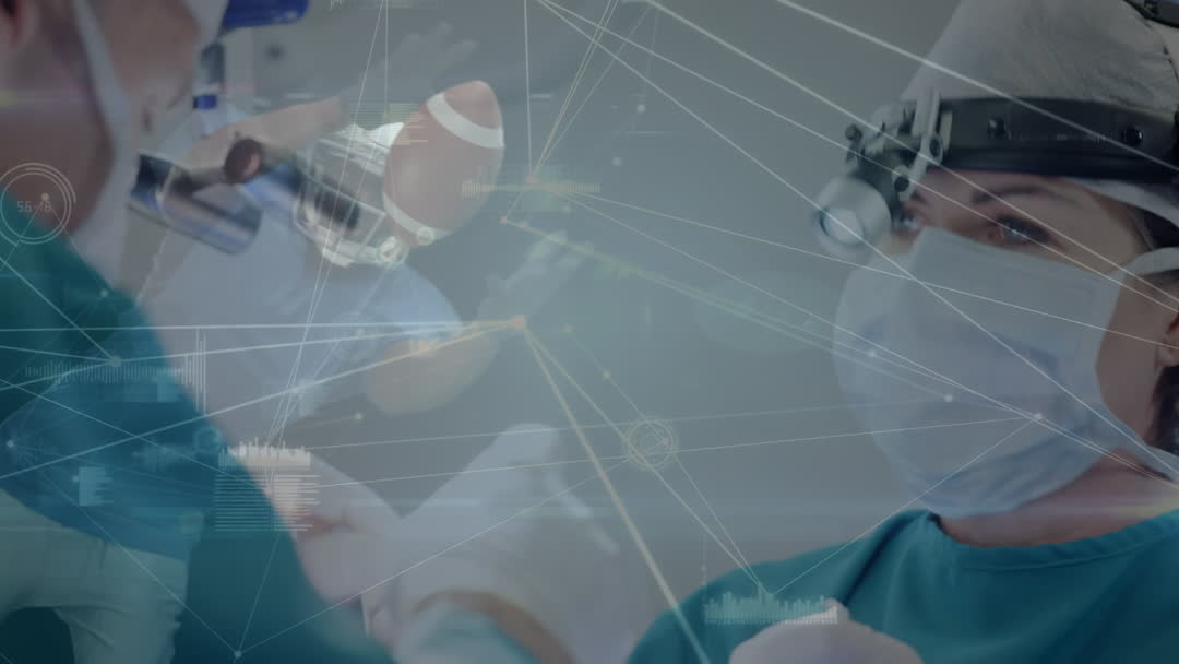 Surgeons are immersed in a sophisticated medical procedure, highlighted by digital connections overlay. This emphasizes collaboration through technology in modern healthcare. Useful for depicting advanced medical practices, innovation in the medical field, or teamwork in an operating room.