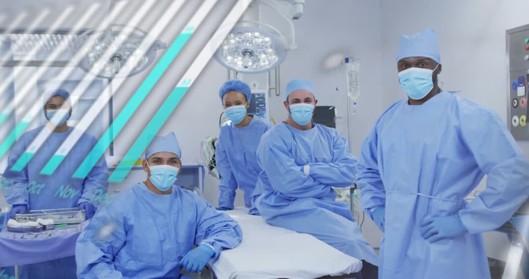 Medical team poised with confidence in high-tech operating room. Imagery highlights advanced technology integrating seamlessly with skilled healthcare professionals, epitomizing efficiency and innovation in modern medical practices. Suitable for informational content on medical advancements, healthcare training, team collaboration tutorials, or promoting hospital capabilities in cutting-edge procedures and care.