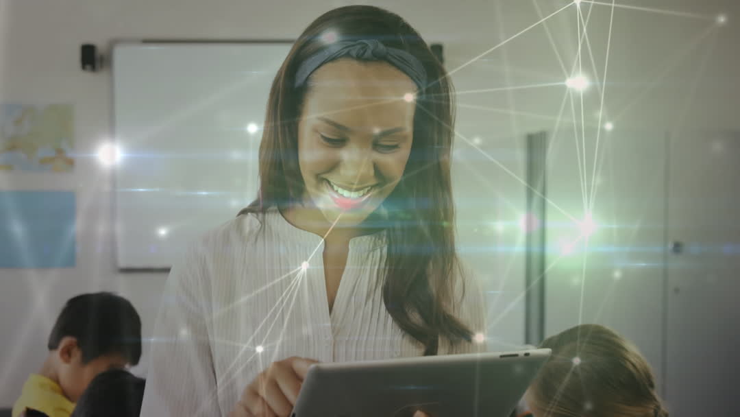 This visual portrays a diverse female educator using a digital tablet amidst a classroom, suggesting forward-thinking teaching methods involving technology. Connections between dots symbolize networks and digital communication, emphasizing the integration of digital tools in education. Suitable for illustrating digital learning environments, tech-centric education concepts, and the evolving role of technology in teaching.