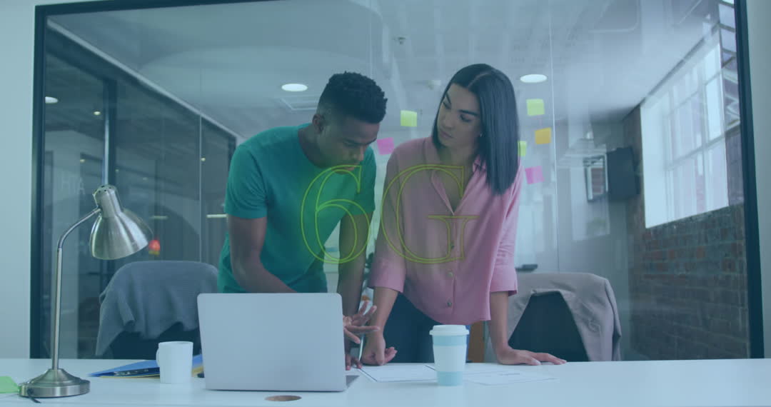 A diverse team of business professionals is collaborating over a laptop with the concept of 6G technology. They are working together in a modern office, symbolizing innovation and future readiness. This visual is perfect for articles and materials about technological advancements, future workspaces, or promoting collaborative teamwork in dynamic sectors.