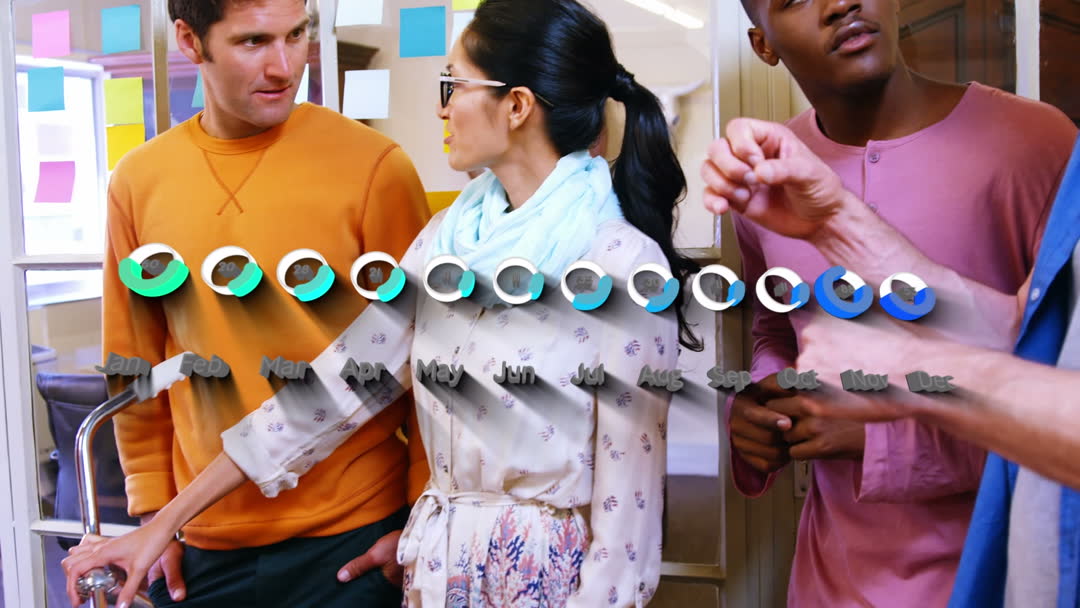 Diverse male and female coworkers discussing in modern office environment with financial data visuals projected overlay every month in animated graph. Perfect for business presentations, corporate training materials, or articles focusing on teamwork, innovation, and data-driven success in professional communities.