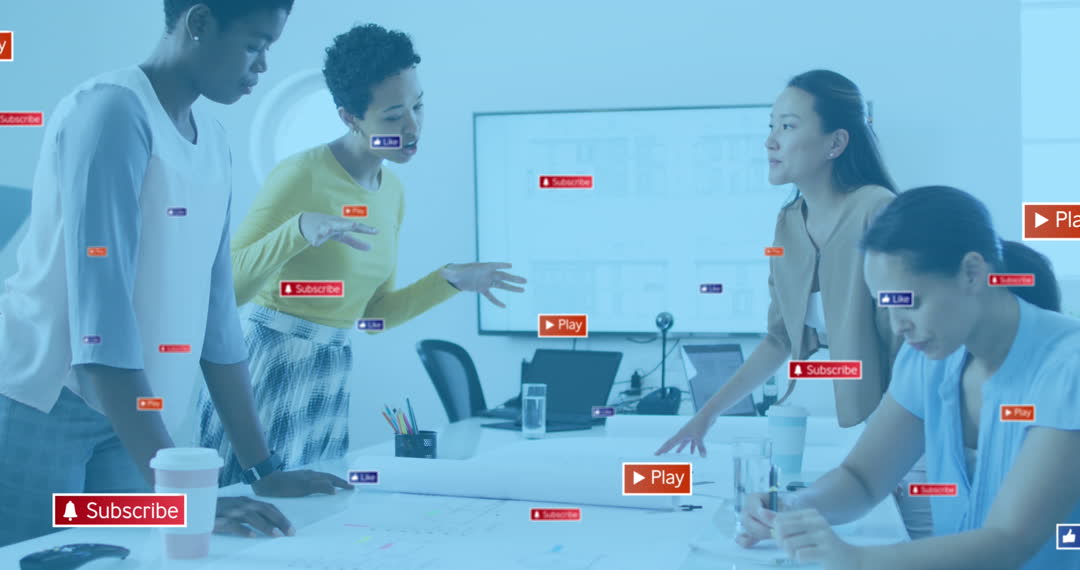 Diverse business team engaging in a collaborative meeting where social media elements are superimposed, displaying icons like subscribe and play buttons. The scene, bathed in a blue tint, shows dynamic interaction among colleagues, combining traditional business with contemporary digital engagement techniques. Ideal for illustrating concepts in digital communication strategies, integrating social media with business processes, and promoting innovative workplace collaboration.