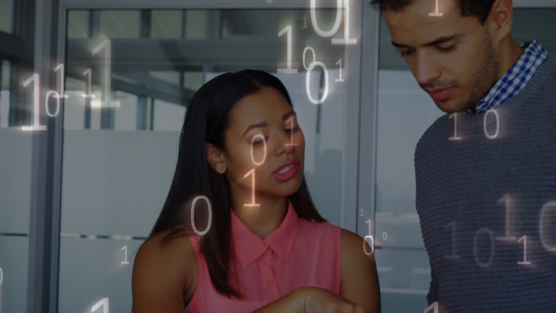 Diverse female and male coworkers discussing in a modern office, with binary code overlay. Useful for content related to team collaboration, digital innovation, technological advancement, and communication in business environments.