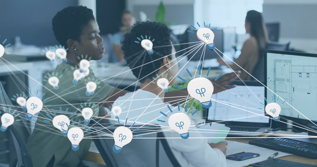 Two African American female professionals collaborating in a modern office environment, surrounded by a digital overlay of interconnected light bulb icons. This symbolizes innovative thinking and working together to generate ideas in a corporate tech setting. Ideal for promoting tech-forward company culture, teamwork and creativity in business materials.