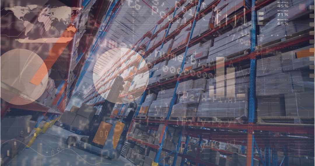 Busy warehouse with shelves symbolizing efficient stock management through modern technologies. Overlay of digital graphs reflecting data-driven logistics solutions. Ideal for depicting global trading data, efficient supply chain management enhancements, or innovations in inventory processing systems.