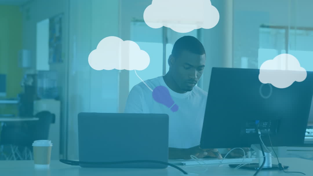 Depicting a focused African American businessman working at a computer with graphical elements representing cloud computing overlain. Great for illustrating themes of modern technology, digital work environments, or innovation in business presentations, educational materials, or technology blogs.