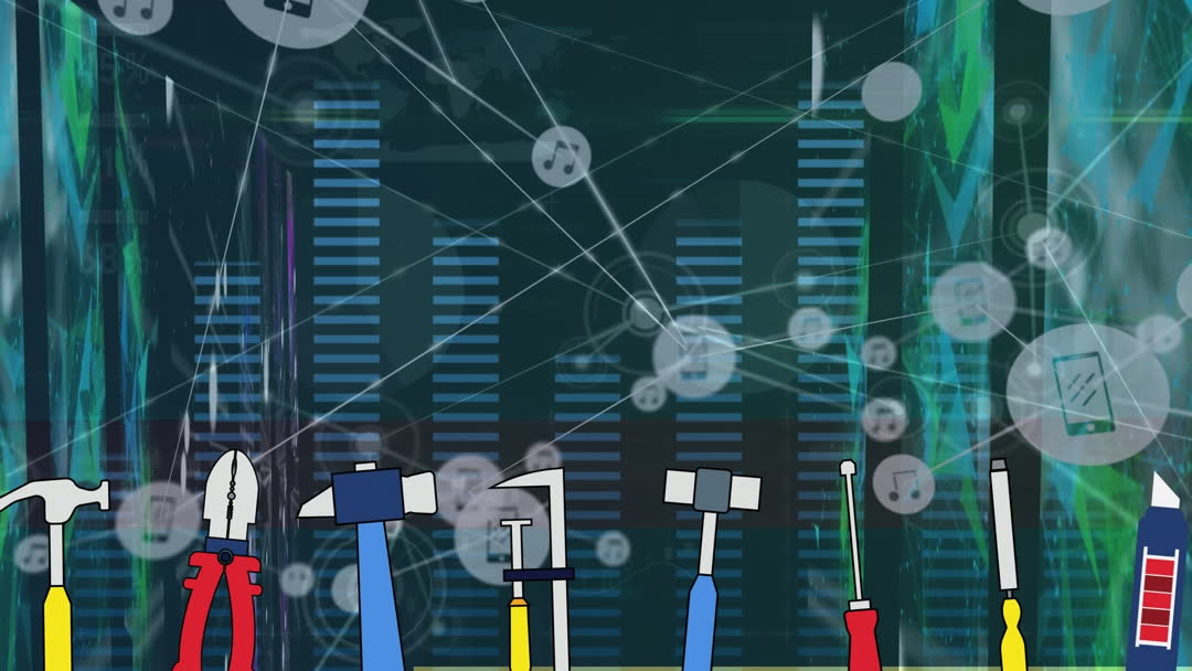 Futuristic concept art showing tools icons over a digital, network-like background illustrates themes of innovation and global technology. It is ideal for representing hi-tech processes, networking ideas, and digital advancement, suitable for technology blogs, presentations, or educational content in digital innovation spaces.