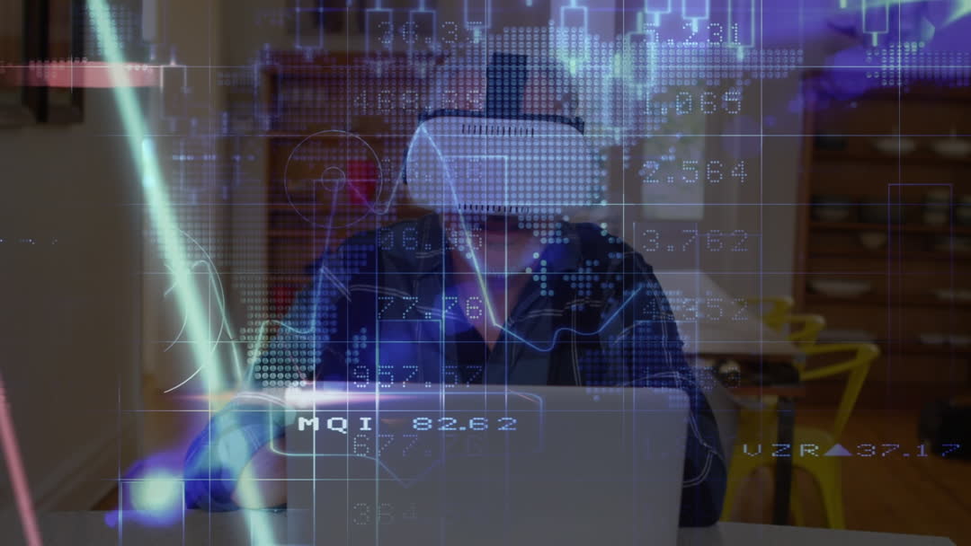 Young businessman dressed in formal attire using a virtual reality headset while working on a laptop. Overlay of data visuals. Theme useful for illustrating concepts of modern technology, virtual interactions, and futuristic innovations in education and business marketing.