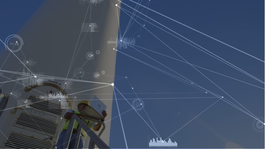 An engineer is standing with equipment surrounded by animation of digital connections, suggesting futuristic innovations in data processing and global technology. Useful for illustrating concepts of modern technology, network security, data analytics, or engineering advancements, and ideal for promotional materials in tech industries.