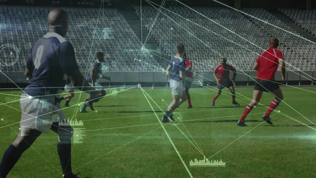Diverse male rugby players on field connected through digital technology lines. This scene highlights the integration of advanced analytics and technology in sports. Useful for illustrating concepts in modern sports analysis, technology integration in athletics, or discussions on enhancing team performance with data.