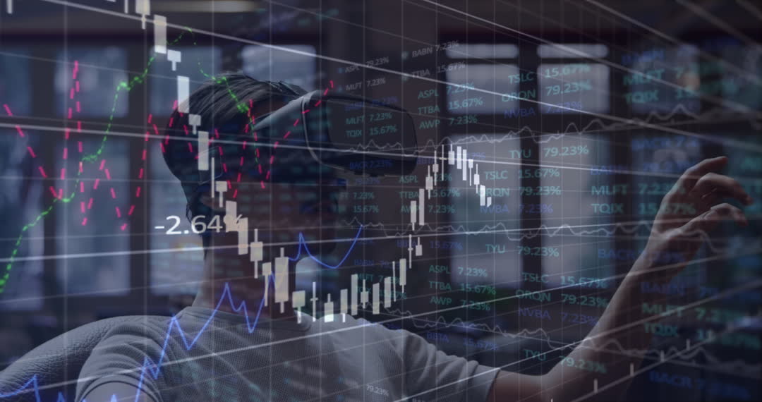 Scene highlights integration of virtual reality in data-intensive environments, showcasing an individual using VR technology to interact with real-time financial data and graphical information. Used in marketing materials targeting finance, technology industries or educational content highlighting the latest advancements in tech-enhanced data analysis tools.
