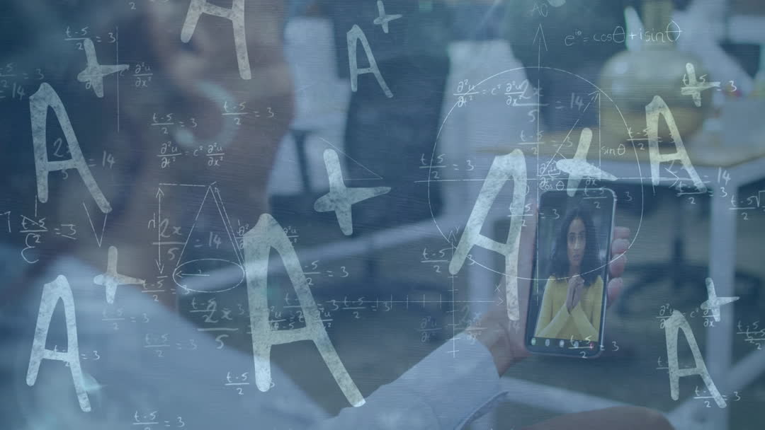 Blend of mathematics and modern technology. African American woman engaged in a video call on her smartphone, showcasing interactive remote learning or online tutoring in a mathematical context. Suitable for illustrating themes of modern education, technology in academics, online learning platforms, and virtual communication.