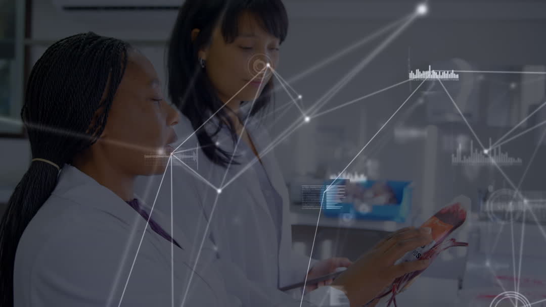 Two female doctors, with diverse backgrounds, analyzing information conveyed on digital interfaces. Futuristic graphics represent global networks and data connectivity, emphasizing technological advancements in medicine. Useful for articles on digital healthcare, innovation in social media assets, or educational content in medical training programs.