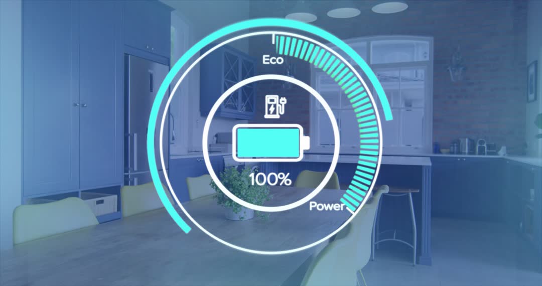 Video showcases concept of smart home energy management through a dynamic charging gauge overlay in a modern kitchen. Useful in tech illustrations, energy seminars, efficient power usage projects, sustainability advertising, modern home design features across technology-focused media.