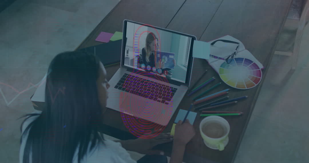 Animation overlays a workspace where a person is participating in a virtual business meeting via a laptop, surrounded by design tools and a colored wheel indicating creative work. Digital graphs and mappings hint at data processing and global communication. Useful for showcasing technology in remote work, global business operations, or digital creativity tools.