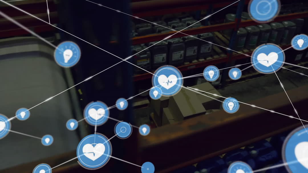 Depicts futuristic digital network icons overlaying a warehouse scene, illustrating advanced technology use in warehouse management. Ideal for articles or presentations about logistics advances, smart warehouses, or the role of technology in improving industry efficiency.