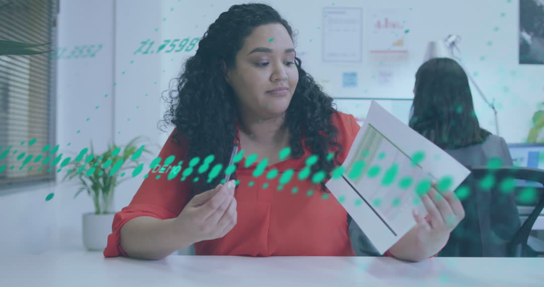 This portrays a biracial businesswoman engaged with digital data processing, set in a modern office environment. Its futuristic overlay and digital elements make it ideal for illustrating technology integration and innovation in business settings. Useful for depicting concepts related to modern digital workplace, global business operations, and tech-enabled environments.