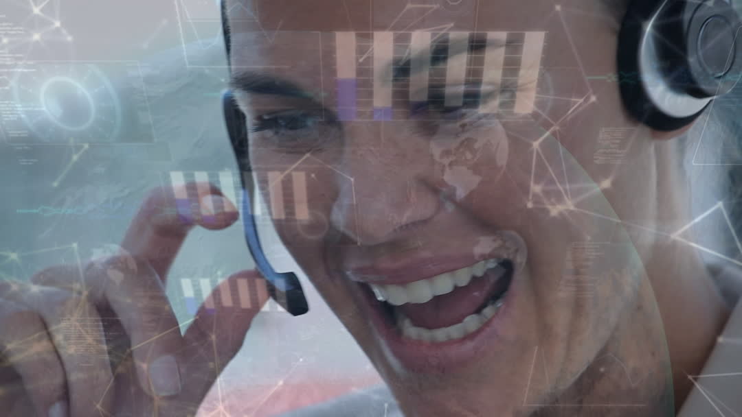 Depicts individual engaged in call center or customer service role with digital overlay representing data and connectivity. Useful for illustrating topics related to modern business communication, customer support systems, digital networking, and technological advancements in service industries.