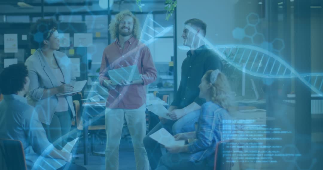 Group of young technology professionals are brainstorming in a modern office. Visual elements such as a DNA helix and floating code overlay underline themes of innovation and biotechnology. Ideal for illustrating concepts of teamwork, technological development, or advanced digital solutions in reports, presentations, or marketing materials.
