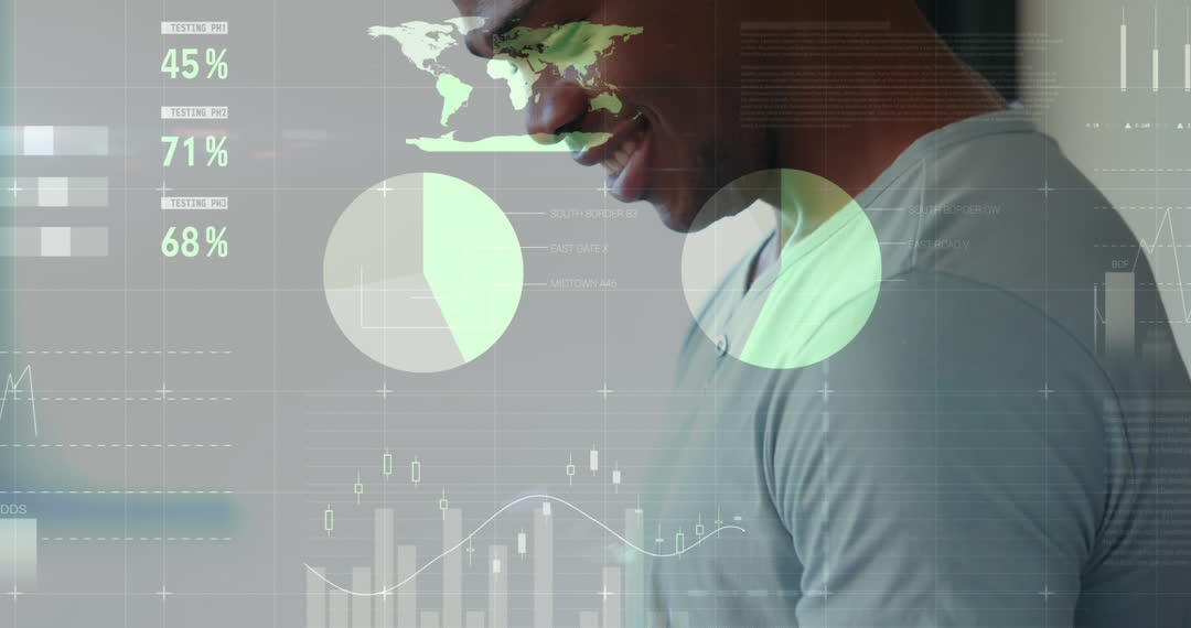This video depicts modern technological interaction featuring an African American man using a tablet with animated data and statistics superimposed. It illustrates themes of technological innovation and data analysis in a digital business context. Perfect for businesses and educators focusing on tech advancements, presentations on data-driven decision making, or articles about the future of technology and analytics.