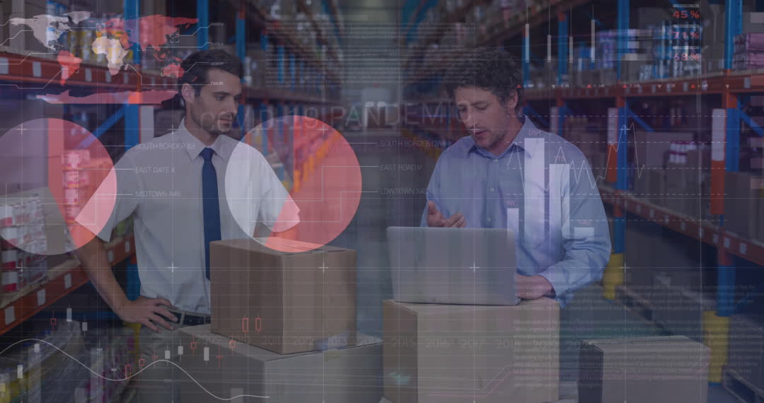Two workers in a warehouse discussing data on a laptop with an overlay of analytical graphs and charts. This video conveys high-tech solutions in logistics and inventory management. Ideal for use in industries focusing on supply chain optimization, digital transformation in warehouses, and global business strategies.