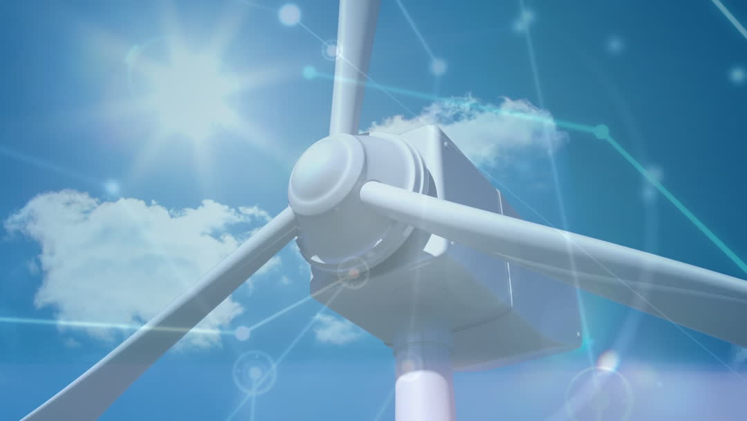 Wind turbine depicted with a digital network overlay, emphasizing the integration of technology with renewable energy solutions. Portrayed against a bright blue sky and sunlight, this video highlights innovation and sustainability in modern energy sources. Excellent for use in articles, presentations, or websites focused on clean energy, technological advancements in sustainability, and environmental solutions.