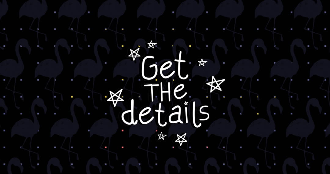 This design features the text 'Get the Details' centered within a pattern of subtle flamingo icons and stars on a black background. Ideal for education-themed content, motivational posters, school presentations, and digital learning resources to inspire attention to detail.