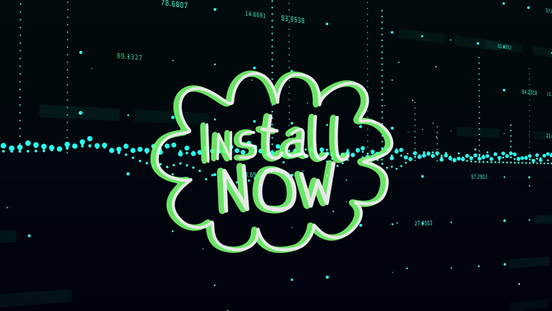 Digital graphic showcasing stylized 'Install Now' text against backdrop of complex data processing. Neon green lettering adds futuristic vibe, suitable for software installation guides, technology promotions, and digital media presentations. Ideal for use as a dynamic cover or professional invitation in tech events involving software launches and updates.