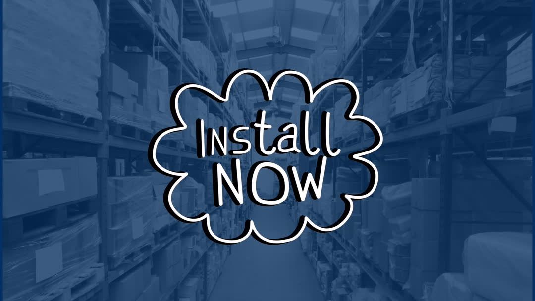 This visual features the text 'Install Now' displayed prominently against a background of a warehouse aisle. Useful for digital marketing campaigns related to logistics, warehouse management, and shipping solutions. It can enhance promotions or advertisements targeting supply chain improvements or installation processes.