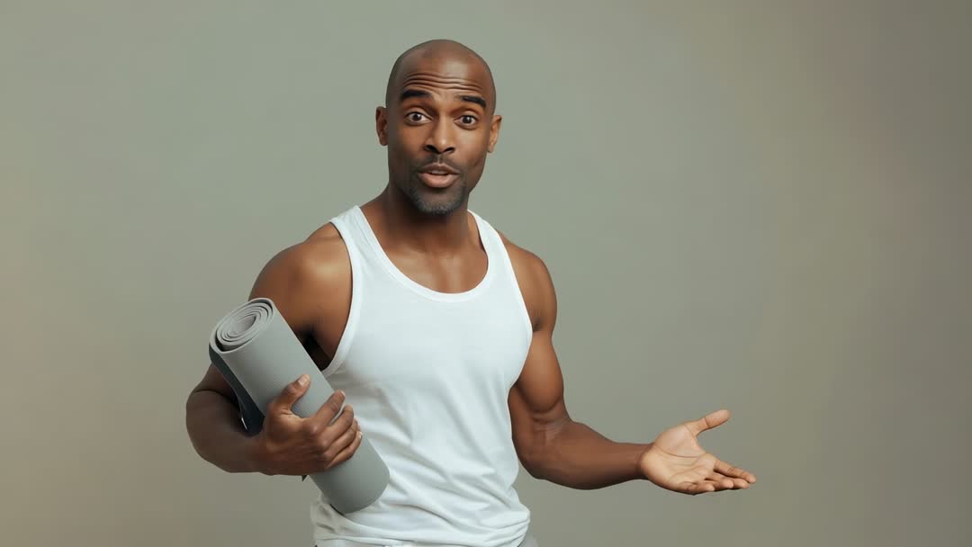 AI Generated Image. Video features athletic instructor in fitness studio gesturing while discussing yoga techniques. He is holding a yoga mat, wearing a tank top and engaging the audience with motivational instruction. Ideal for use in fitness videos, wellness blogs, yoga teaching materials, and promotional content for health and exercise programs.