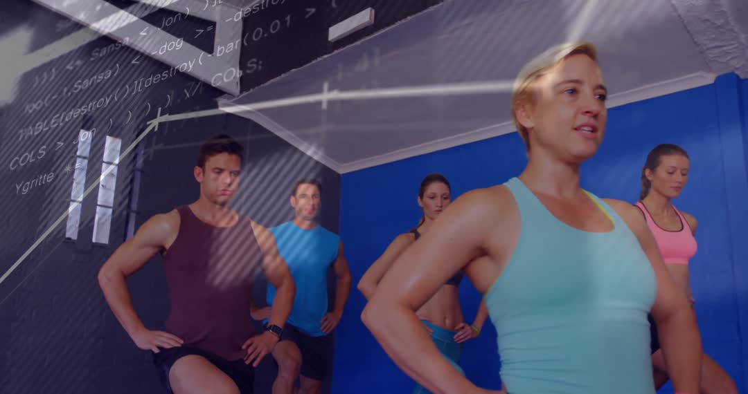 An energetic fitness instructor guiding a diverse group during a lunge exercise at a gym. Screen overlay shows moving graphs and data, creating a sense of advanced performance tracking. Suitable for themes around modern fitness, health, motivation, group training, technological impacts on workouts, or wellness research.