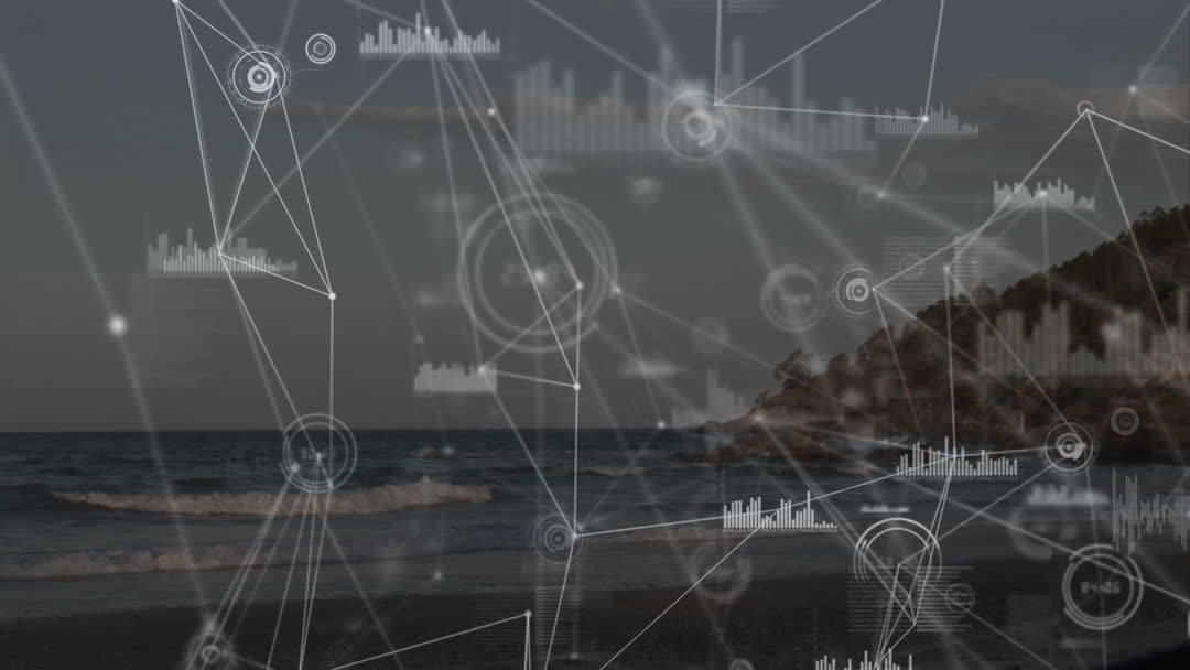 Integrated Digital Network Overlay on Serene Coastal Landscape Video