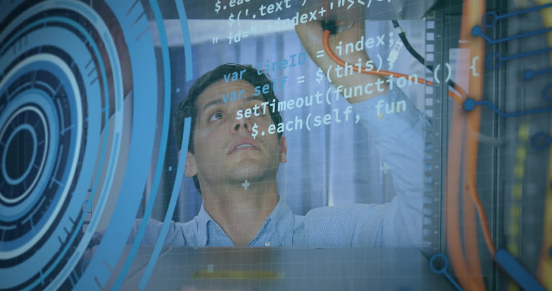 Young man interacts with advanced technology, examining wire connections in warehouse setting while code displays in foreground. Ideal for projects on digital transformation in supply chain management, tech-driven logistics, and data integration in modern businesses.