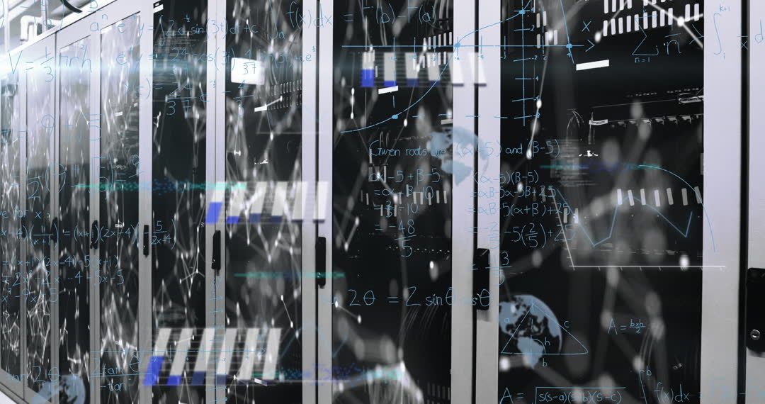 Digital animation blends displayed mathematical equations with the server room environment, symbolizing the integration of technology with computational analysis. Ideal for illustrating the concepts of data science, technology advancements, cybersecurity, engineering systems, and hybrid computing strategies, this abstraction communicates modern technological dynamics and digital data interaction.
