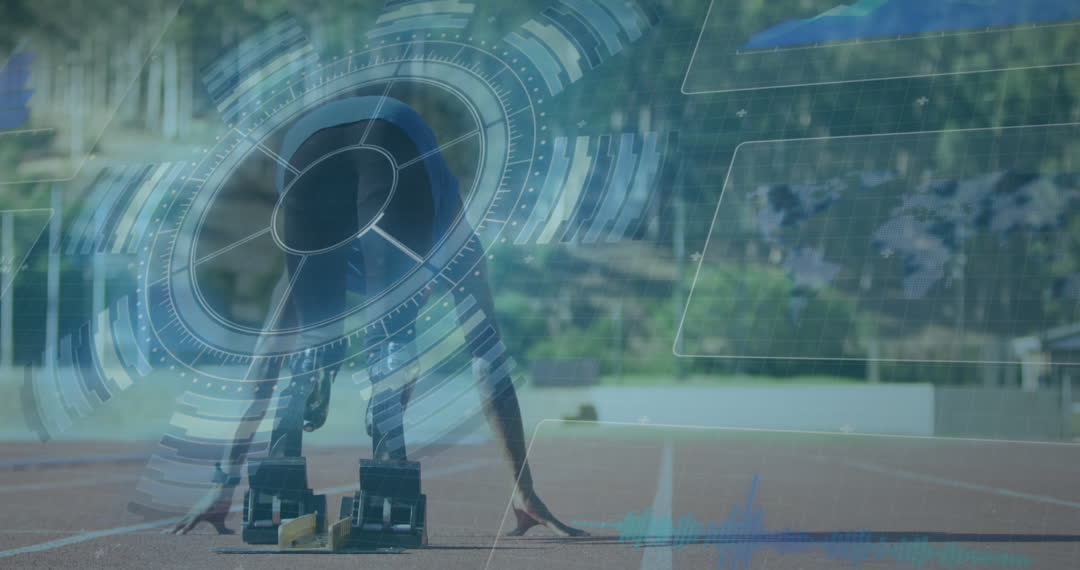 Depicts seamless integration of technology with sports, showing an athlete with a running blade at the starting line contrasted against digital elements. Ideal for illustrating modern sport technologies, innovations in adaptive athletics, inspiring perseverance, and technological advancements enhancing physical capabilities.