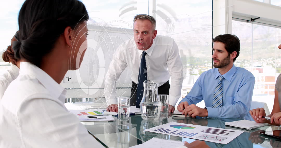 Scene of business professionals engaged in a tense meeting, supplemented by financial data and digital graphics overlays. Ideal for illustrating corporate environments, business analysis topics, financial reporting themes, and teamwork tensions in a professional context.