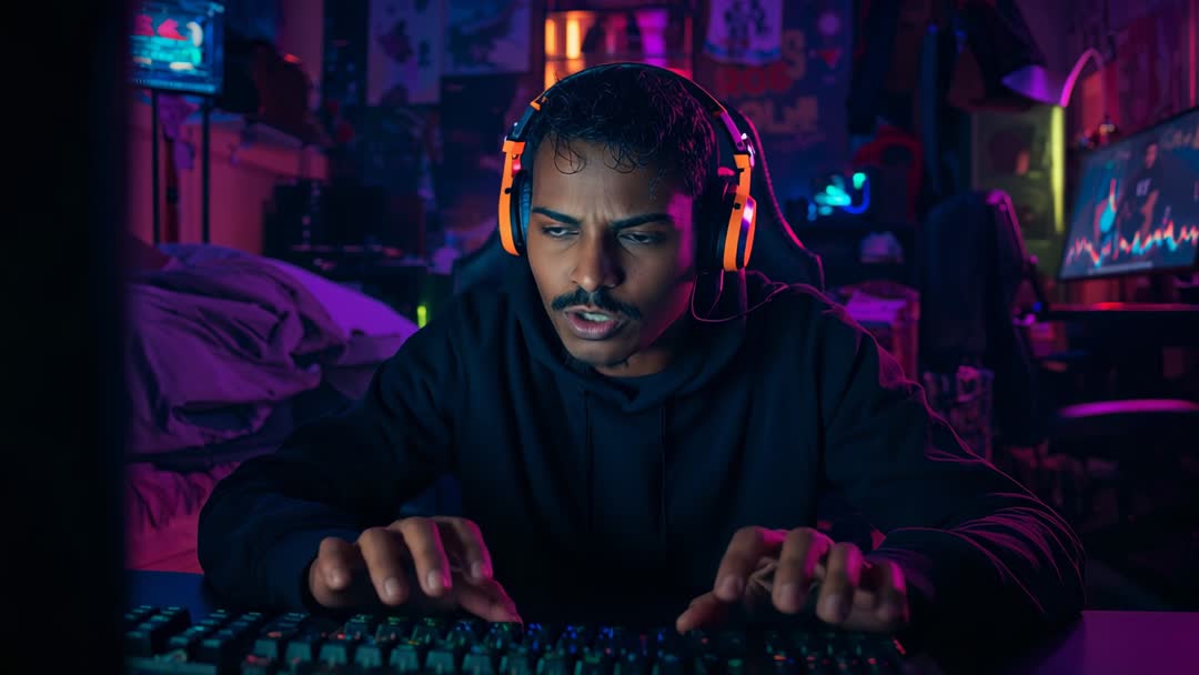 - Intense Gamer Reacting to Sudden Event in Neon-Lit Room
