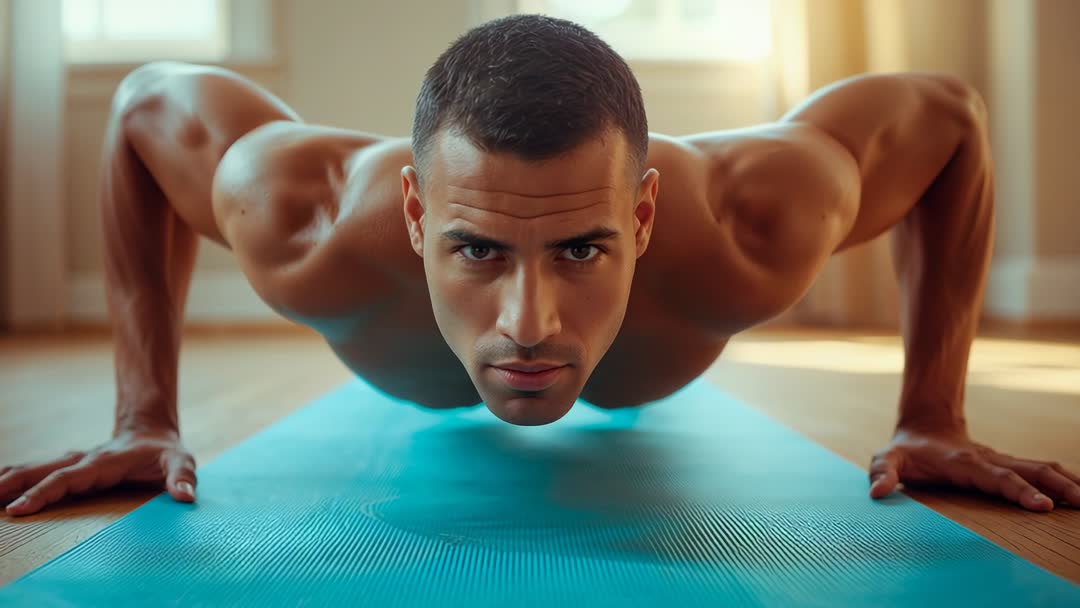 - Intense Home Workout: Man Engaged in Push-up Routine