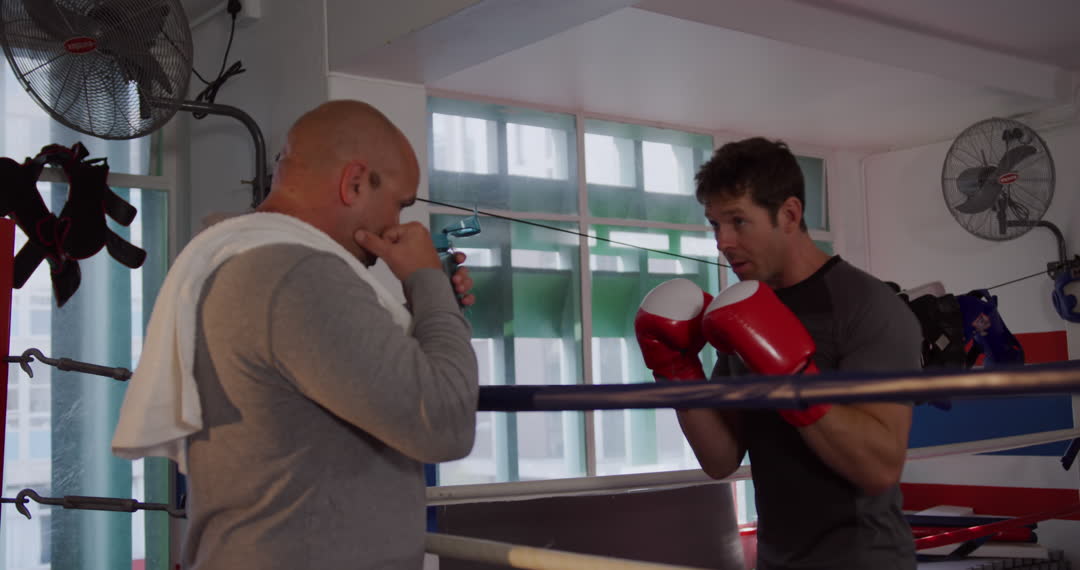 Caucasian male instructor guides a male boxer in Krav Maga techniques within a boxing gym environment. The intense interaction reflects a robust training regimen, suitable for articles or ads related to martial arts, fitness programs, or athletic training methods.