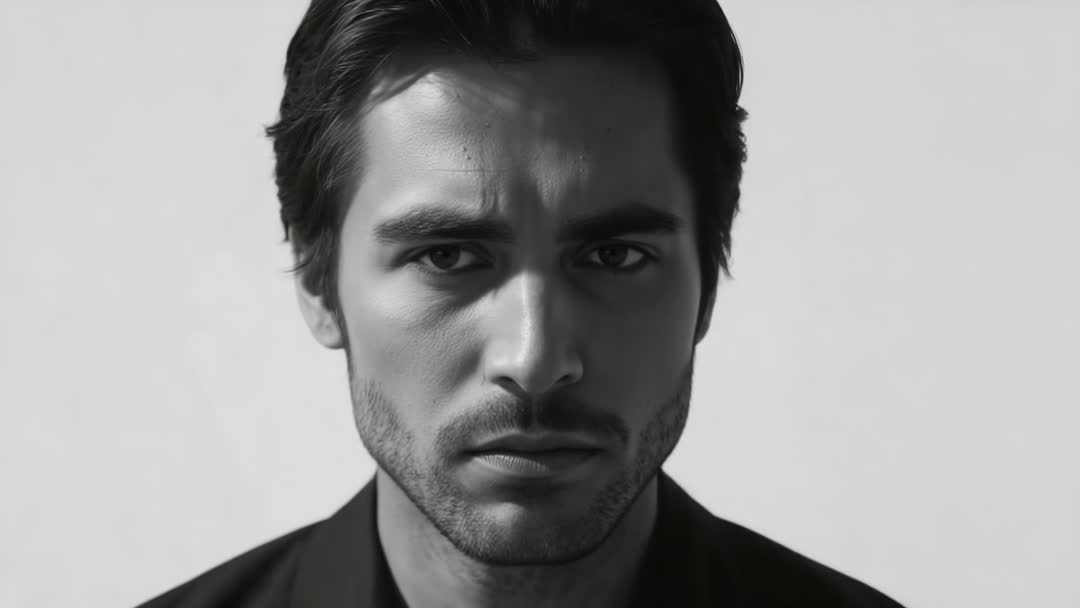 AI Generated Image. This black-and-white video showcases a male model displaying an intense stare, with an emphasis on chiaroscuro to enhance the dramatic mood. The portrait captures a strong, focused expression, highlighting features for a professional and disciplined vibe. Ideal for marketing campaigns targeting industries valuing determination and concentration. Also suitable for creative projects themed around seriousness, focus, and depth.