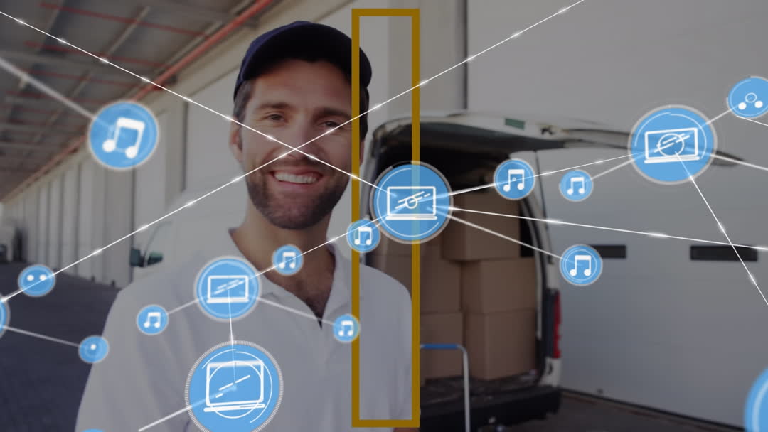 Conceptual illustration showcases a delivery professional in a warehouse, with superimposed digital connectivity symbols, emphasizing logistics technologies like IoT and smart shipping networks. Ideal for content about technological advancements in global delivery systems, e-commerce, and supply chain integration.