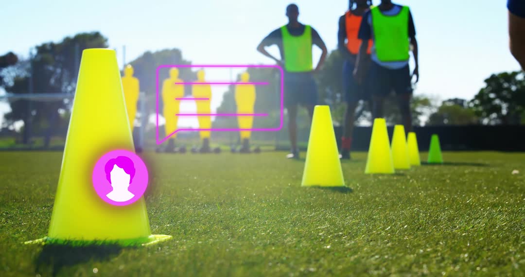 AI-enhanced video showcasing integration of digital analytics in a soccer training environment, featuring cones seamlessly combined with animated data visuals. Ideal for illustrating concepts in sports technology, enhancing athlete's performance through data, and innovative training methods.