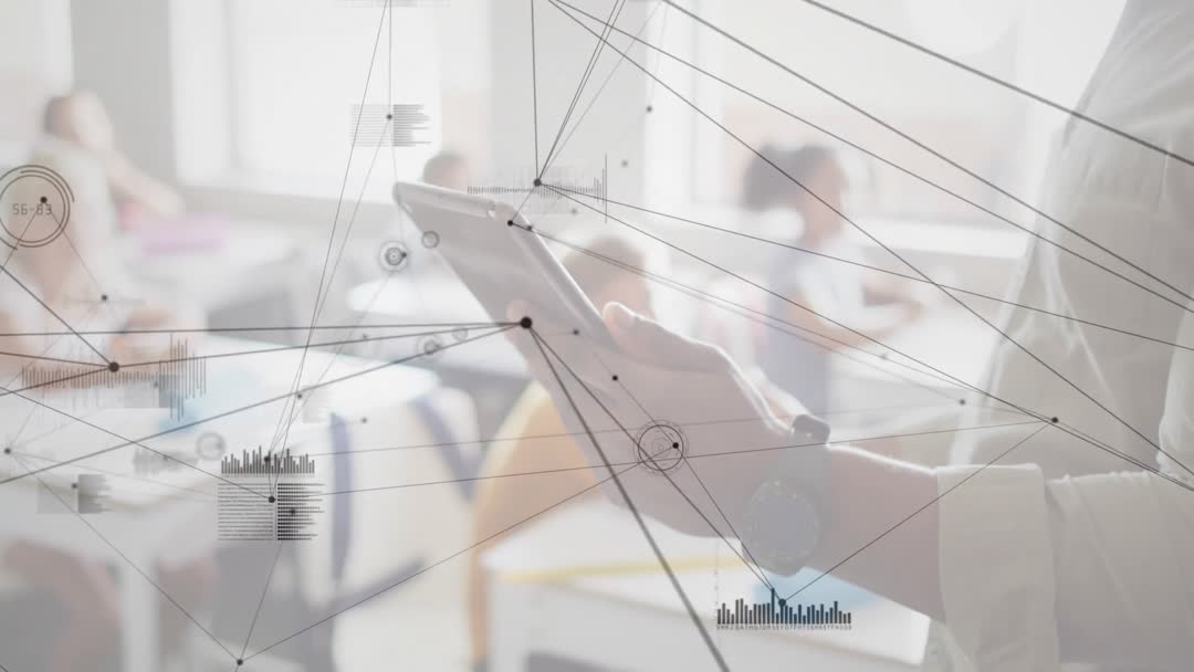 This scene portrays a teacher using a tablet to enhance digital learning in a classroom environment. Features about interactivity, technology, and innovative teaching methods are visualized with abstract network nodes and charts. Ideal for illustrating concepts of educational technology, modern teaching practices, and collaborative learning environments.
