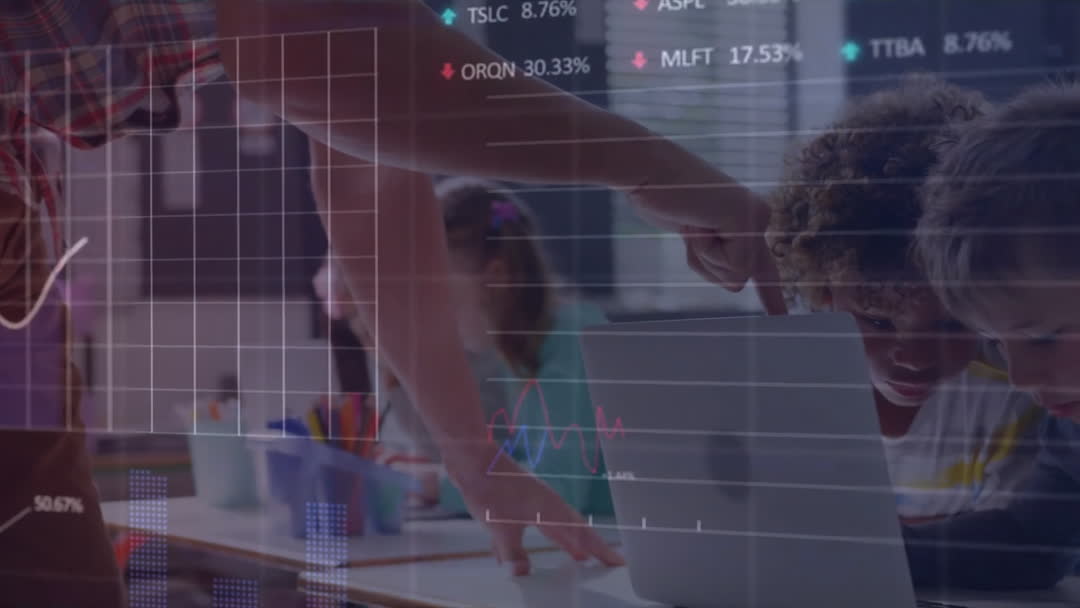 This visual depicts a diverse group of schoolchildren using a laptop, guided by a teacher in a modern classroom. Overlay of data visualization suggests technological integration in education. Useful for illustrating forward-thinking teaching methods, educational technology, collaborative learning showcasing advanced classroom setups, or communicating modern pedagogical techniques to audiences interested in educational reforms.
