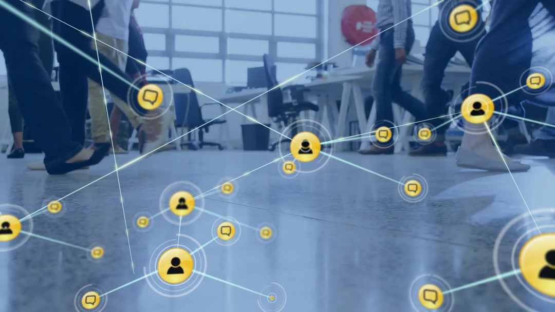 Interactive Network Icons Overlaying Busy Workspace Atmosphere Video