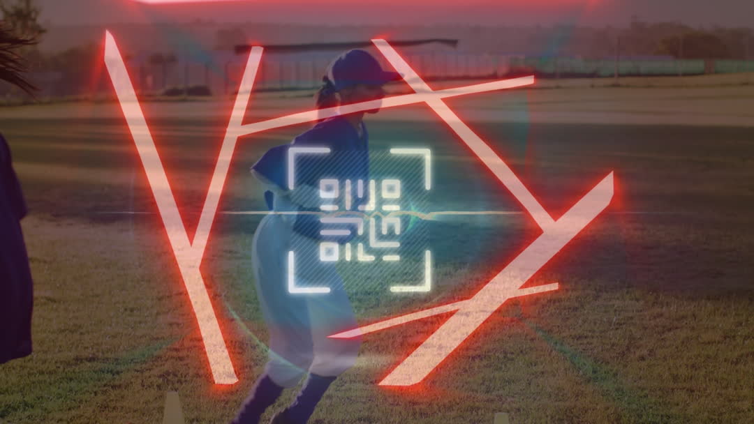 Dynamic rendering combines QR code with diverse baseball players on a field seen with bright neon geometric shapes. Perfect for digital interfaces, promotional content involving sports and technology, or engaging multi-media presentations connecting audiences with futuristic and global visual themes.