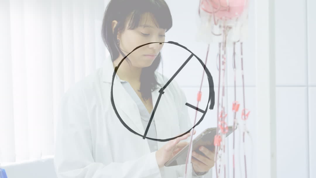 Scene showing a female scientist of Asian descent engaged in research while using a digital interface mockup, representing innovation and technology integration in laboratories. The inclusion of an animation overlay suggests dynamic widget or augmented reality applications. Ideal for illustrating modern science environments, tech-based educational tools, or innovation presentations.